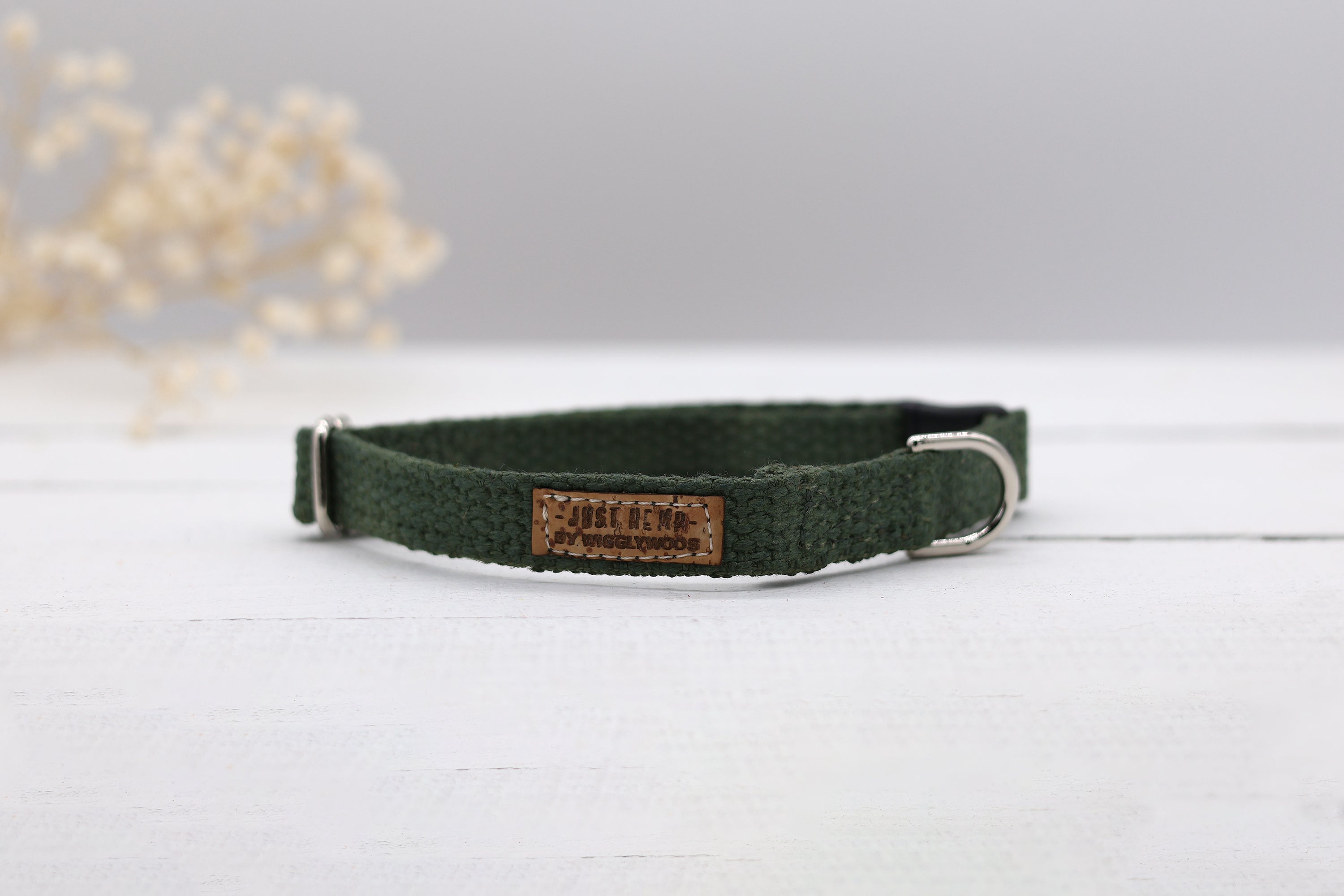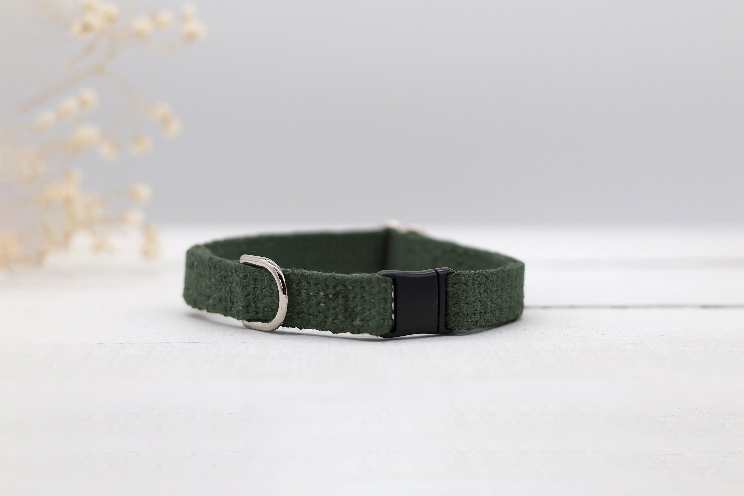 Eco friendly, lightweight Just Hemp Cat Collar. The sage green cat collar is hand-dyed in our studio and comes with a breakaway buckle and a D-ring to attach pet tag (not for leash attachment).
