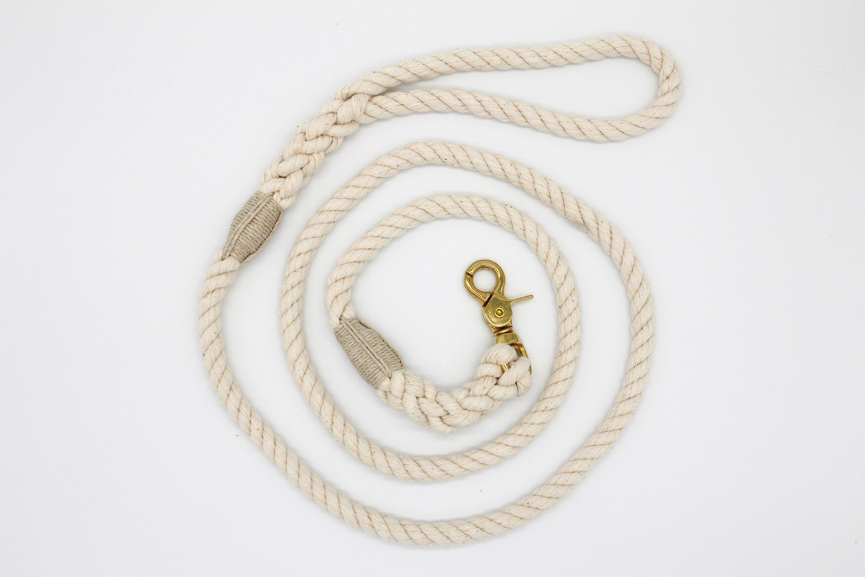 The Cotton rope leash is strong enough for your and your pup but with the soft feel of cotton. You have your choice of Brass or Nickel plated trigger snaps.
